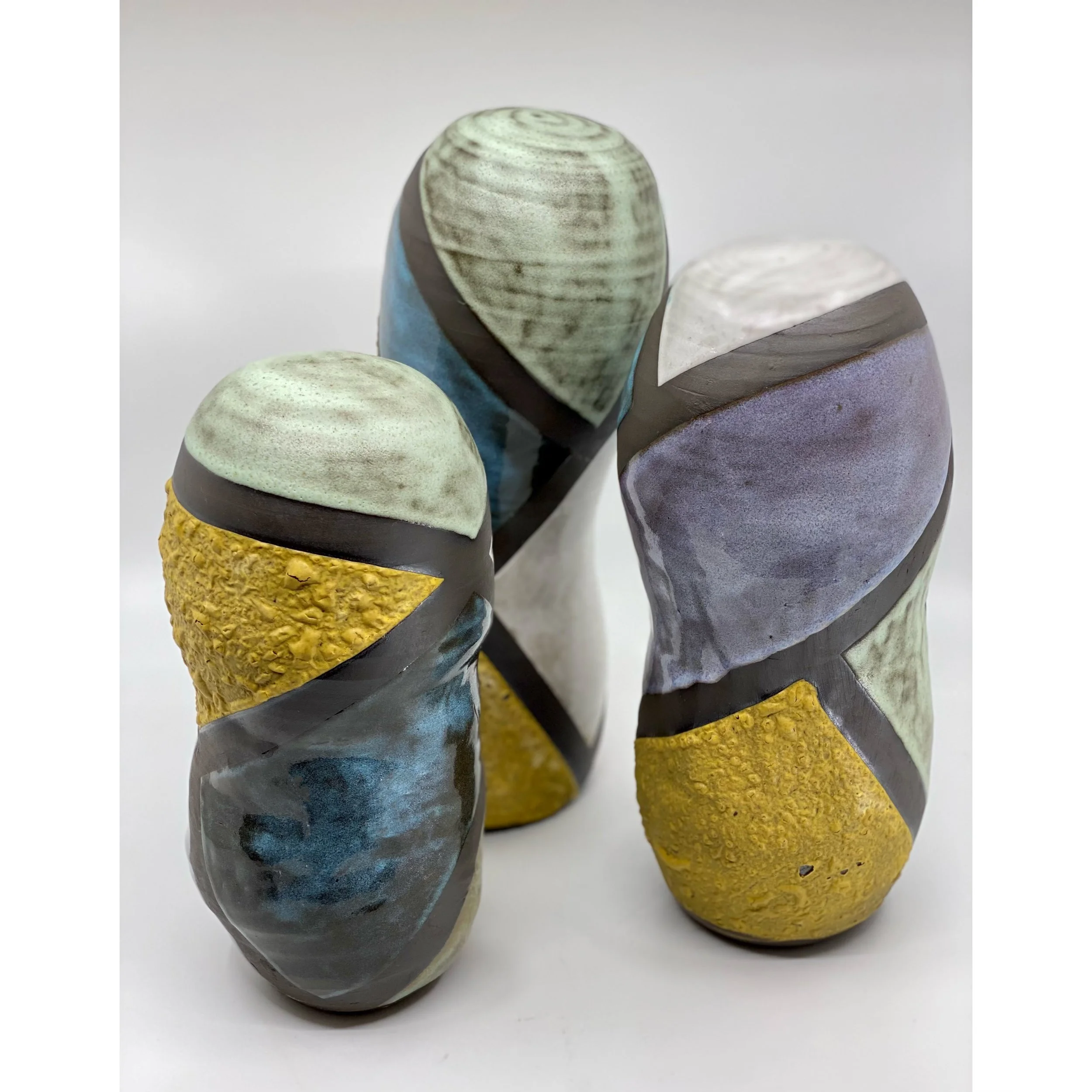 Three ceramic dome sculptures, 2022, stoneware, glaze, 4” x 10, 11, 12”. This trio of thrown and altered sculptures is a perfect addition to your artistic home.